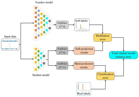 During the training process of the student model, knowledge distillation introduces the predictions of the teacher model as additional targets while learning the error between the input data and the true sample labels. Generally, the cross-entropy loss function is chosen as the loss calculation function between the model’s test probability values and the true labels. Then, the distilled loss  between the teacher model and the student model, as well as the loss  between the predictions of the student model and the true labels, are represented by Equation (6) and Equation (7), respectively.
