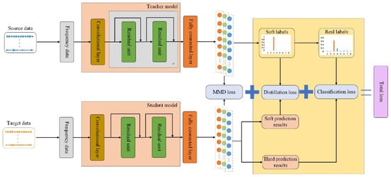Knowledge distillation, proposed and popularized by Geoffrey Hinton et al. in 2015 [], is a technique that can be viewed as a special case of transfer learning. It transfers knowledge from a complete large network (teacher model) to a smaller network (student model) in the form of soft labels, thereby enhancing the accuracy of the network [,]. Therefore, this paper proposes a domain-adaptive residual network model based on the knowledge distillation framework. To prevent gradient vanishing as CNNs deepen, a variable-scale residual network is employed to extract domain-invariant fault features from both the source and target domain data. Based on the variable-scale residual network, a knowledge distillation framework is constructed, enabling the student model in the framework to reference soft label information from the teacher model while reducing the model’s size for ease of deployment in industrial scenarios. Domain adaptation is achieved by measuring the difference between the source and target domain data in the feature space using maximum mean discrepancy (MMD), enabling cross-device invariant feature learning.