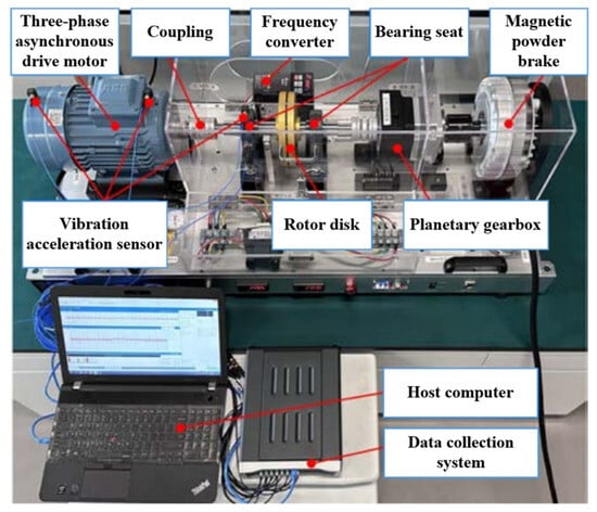 In this case study, two different models of bearings are selected for experimental validation. The source domain dataset A is derived from the publicly available bearing fault dataset from Case Western Reserve University (CWRU) [], featuring SKF6205 deep groove ball bearings with a fault size of 0.5334 mm operating at 1772 r/min and sampled at 12 kHz. The target domain dataset B originates from the bearing seat vibration signal dataset from Qilu Normal University (QLNU), as illustrated in Figure 4. The selected model is UCPH206 ball bearings with a fault size of 1 mm operating at 900 r/min and sampled at 51.2 kHz. The selection of vibration acceleration sensor type is chosen as an accelerometer sensor. The motor power ranges from 0.5 kW to 5 kW, and the maximum load for the electric brake is 100 Nm. The health status labels for both datasets are presented in Table 5.