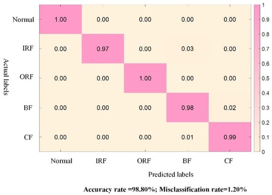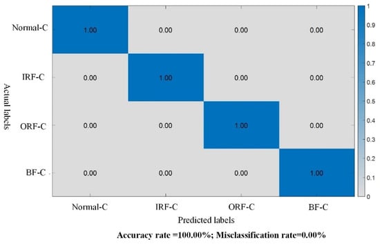 Initially, the source domain dataset A is fed into the knowledge distillation framework of the proposed KD-ResNet-DA method. The variable-scale ResNet teacher model is utilized to extract fault features from the source domain dataset for training. The testing results on the source domain dataset are illustrated in Figure 5. It can be observed that the accuracy of the teacher model in the KD-ResNet-DA method is 100.00%.