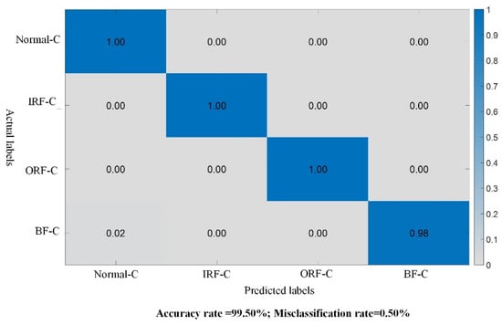 Subsequently, based on the fault soft labels obtained from the teacher model, the constructed QLNU bearing target domain dataset with incomplete inter-class data is inputted into the student model of the proposed KD-ResNet-DA method for training and testing. The experimental results are depicted in Figure 6. It is evident that the accuracy of the student model in the target domain reaches 99.50%. This preliminary validation confirms the effectiveness of the proposed model under the scenario of cross-device incomplete inter-class data.