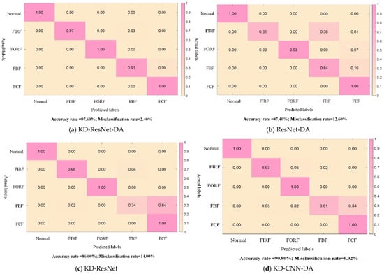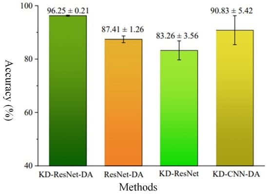 Next, based on the fault soft labels obtained from the teacher model, the established target domain inter-class incomplete dataset is input into the student models of the KD-ResNet-DA method and the three comparison methods for training and testing. The experimental results of KD-ResNet-DA, ResNet-DA, KD-ResNet, and KD-CNN-DA in the ablation experiments are shown in Figure 8. The accuracies of KD-ResNet-DA, ResNet-DA, KD-ResNet, and KD-CNN-DA are 97.60%, 87.40%, 86.00%, and 90.80%, respectively, with only the proposed KD-ResNet-DA method achieving an accuracy higher than 95.00%. This preliminarily proves the effectiveness of the KD-ResNet-DA method in the presence of cross-device inter-class incomplete data and validates the contributions of the distillation loss provided by the teacher model, the loss of probability distribution distance at the feature level, and the multi-scale residual network model proposed in this study.