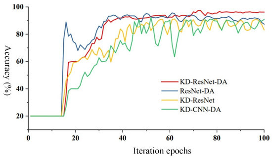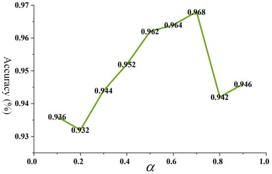 Figure 11 illustrates the impact of different  values on the diagnostic results of KD-ResNet-DA. Generally, the choice of  needs to be adjusted according to the specific task and dataset, as different settings may yield different effects. Therefore, in this case, experiments were conducted to investigate the influence of the distillation loss weight on the diagnostic results. As shown in Figure 11, the accuracy increases as the value of  increases. The KD-ResNet-DA model achieves optimal accuracy when  values are 0.6 and 0.7. However, as it approaches 1, the model’s accuracy rapidly decreases. This further confirms that both classification loss and distillation loss contribute to the model’s performance gains.