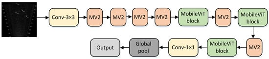 The structure of MobileViT is shown in Figure 1. In Figure 1, one can observe that MobileViT primarily comprises regular convolutions, a MobileViT block, MV2, global pooling, and fully connected layers.
