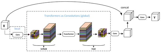 The MobileViT block is capable of learning global representations from various perspectives, effectively enhancing the ability of the algorithm to encode both local and global information. Its standard convolution involves three operational steps: unfold, local processing, and folding. The MobileViT block uses Transformer to conduct global modeling to replace local modeling in convolution, thus making the MobileViT block have the properties of both CNN and ViT, enabling it to better learn feature representation using fewer parameters and simpler training. The structure of the MobileViT block is shown in Figure 2. First, the feature map is put through the convolutional feature extraction module for local feature modeling. Second, the global feature modeling is performed through the structure composed of the unfolding module, the Transformer module, and folding module (UTF). Third, the shortcut branch splices the input feature maps in the channel dimension. Finally, the output features are obtained by feature fusion through a convolutional layer with a convolutional kernel size of 3 × 3.