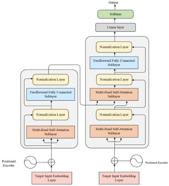 The Transformer structure is shown in Figure 3. The Transformer architecture consists of an encoder and a decoder, each comprising multiple layers. Each layer is composed of a multi-head self-attention mechanism and a feedforward neural network. The gray part on the left half in the figure is the encoder part, and the gray part on the right half is the decoder part. The multi-head self-attention layer consists of multiple self-attention sub-modules. It enables each position in the input sequence to interact with others, thereby comprehensively capturing global information within the input sequence. The feedforward neural network sublayer processes features at each position through fully connected layers and activation functions, thereby enhancing the model’s expressive capacity. The normalization layer comprises residual connections and normalization operations. Residual connections aid in preventing network performance degradation, while normalization operations are used to normalize the activation values of each layer.