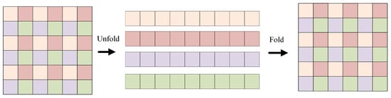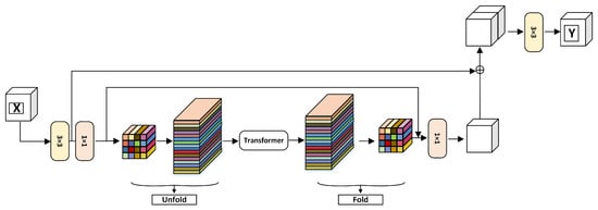 The UTF structure belongs to the global perception module, and its effect is equivalent to the self-attention calculation module. Its specific calculation process is shown in Figure 5. Firstly, the feature map is divided into many patches. Each patch has a size of 2 × 2, consisting of 4 pixels. During attention calculation, each token is only computed with blocks of the same color. This effectively reduces computational complexity. In the algorithm, the input feature X has a size of W × H × C. After undergoing feature extraction with a 3 × 3 convolution and a 1 × 1 convolution, its channel number becomes d. After the UTF structure, its size remains unchanged. Subsequently, a 1 × 1 convolution is applied, reducing the channel number of the feature to C. The final output feature Y of the module has the same size as the input X.