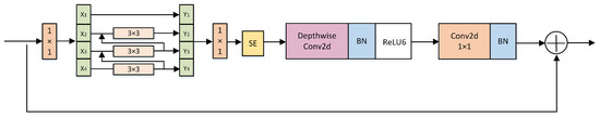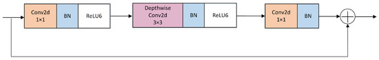 The structure of the MV2 module in MobileViT is the same as the structure of the inverted residual block in MobiletNetV2, which is shown in Figure 6. Initially, the feature maps undergo expansion through a 1 × 1 convolutional layer to increase their depth. The purpose of this step is to provide the network with sufficient expressive capacity to handle complex feature structures. Subsequently, the expanded feature maps are processed through depthwise convolutional layers. Depthwise convolution significantly reduces the number of parameters and computational load of the network. Following this, the depth of the expanded feature maps is reduced back to the original depth through another 1 × 1 convolutional layer. No activation function is applied at this stage to minimize information loss. Additionally, to further enhance network performance, the MV2 module incorporates residual connections. This design facilitates information flow and effectively improves the training stability and performance of the network.