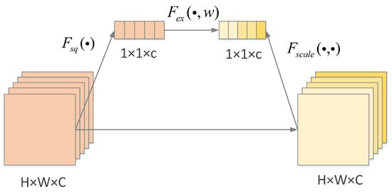 where  is the output of the channel,  is the input of the c channel, H is the height of the feature map, W is the width of the feature map, and T is the Squeeze operation function. This is followed by the excitation operation to capture the correlation between the channels and generate the weights for each channel by training, which is computed as follows: