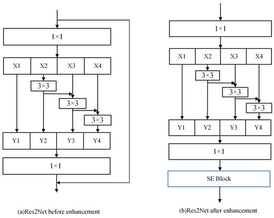 In many visual tasks, multi-scale feature extraction plays a very important role in improving the information-capturing ability of images. As convolutional neural networks continue to advance, researchers are moving closer to improving the ability of the algorithms to characterize features at multiple scales to achieve performance improvements. To obtain feature extraction networks with better characterization capabilities, Res2Net has been proposed in the literature []. Inspired by grouped convolutions, Res2Net replaces the 3 × 3 convolution in the bottleneck block with several small convolutional groups. These convolutional groups are connected using a hierarchical residue-like style to increase the scale representation of the output features. The hierarchical residue-like connection is defined as shown in the following equation: