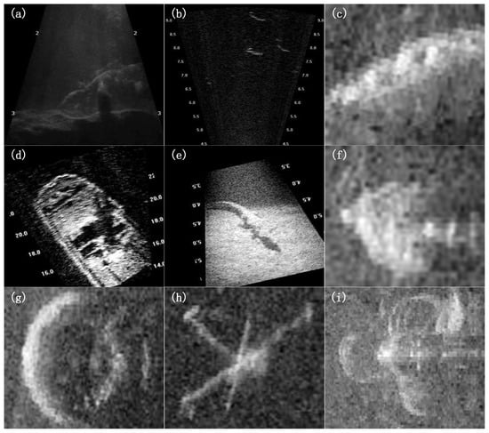 Acquisition of underwater sonar data for real-world scenarios is greatly limited due to equipment constraints as well as national defense and military reasons. In this paper, the acquired sonar data are fused considering the real scenarios and classified into fourteen classes for the recognition algorithm in this paper, which are: persons, fish, shipwrecks, alligators, bottles, cans, chains, drink cartons, hooks, propellers, shampoo bottles, standing bottles, tires, and valves. Table 3 presents the dataset with its categories and their respective sizes in terms of total, training set, validation set, and test set. Some of the sonar data categories are displayed in Figure 10, where Figure 10a is a person, Figure 10b is fish, Figure 10c is a chain, Figure 10d is a shipwreck, Figure 10e is a alligator, Figure 10f is a drink carton, Figure 10g is a tire, Figure 10h is a valve, and Figure 10i is a propeller.