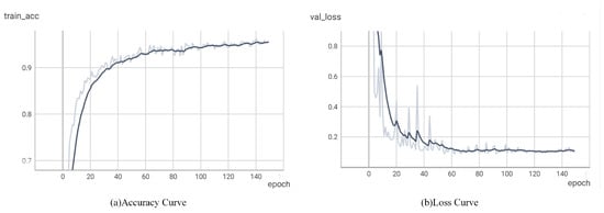To train parameters that apply to underwater sonar images, this study conducted experiments to train the algorithm from scratch, and the weights were randomly initialized. In the experiment, the dataset was divided into a training set, testing set, and validation set with a ratio of 8:1:1. The input image size received by the algorithm was 224 × 224. Figure 11 shows the accuracy as well as loss curves of the model in this paper, where Figure 11a shows the accuracy curves and Figure 11b shows the loss curves, where the dashed line is the actual value and the solid line is the smoothed result of the actual value. As can be seen from the figure, the algorithm converges after about 80 epochs.