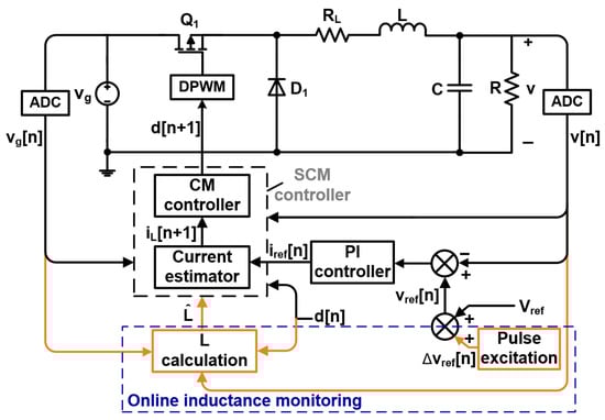 Figure 1 illustrates a block diagram of the proposed online inductance monitoring method. It consists of a MOSFET switch, Q1; a diode, D1; an inductor, L; inductor equivalent series resistance, RL; an output capacitor, C; and a load resistor, R. The line and output voltages used in the digital controller and online inductance monitoring module are sampled by AD converters (ADCs).