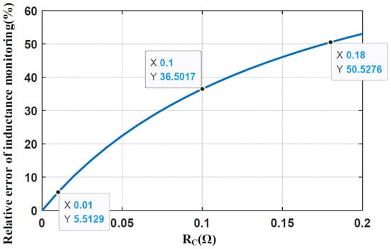 The simulation results for different RC versus relative errors of inductance monitoring are shown in Figure 4, indicating that the monitoring error increases with RC. When RC < 0.01 Ω, the calculation error is less than 5.52%, which is acceptable. When RC = 0.1 Ω, the monitoring error rises to 36.5%, which means the effect of RC on inductance monitoring cannot be ignored. This error happens when ESR increases because of the aging effect or when a high ESR capacitor is used.