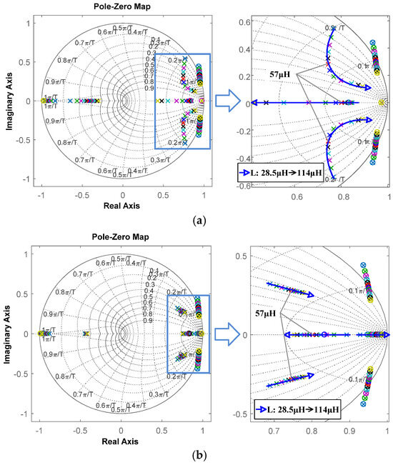 For the system without inductance monitoring, L in  varies from 28.5 μH to 114 μH, while  in the SCM controller is set as the nominal value (57 μH). The pole-zeros of the system and open-loop Bode plot under different L values are shown in Figure 6a and Figure 7a, respectively. As Figure 6a shows, the right figure is a partially enlarged detail of the left figure, and the blue arrow line represents the migration of the pole-zeros of the system when L in the buck circuit varies from 28.5 μH to 114 μH. As L deviates from the nominal value, poles are changed, and two of them move toward the boundary of the unit cycle, which means the transient response gradually degrades. The crossover frequency and phase margin from Figure 7a are listed in Table 1. When L changes to 28.5 µH, the crossing frequency nearly doubles increases, and the phase margin decreases to 17°. This means that the stability and transient response capability of the system without inductance monitoring have significantly decreased, which is consistent with the analysis in Figure 6a.