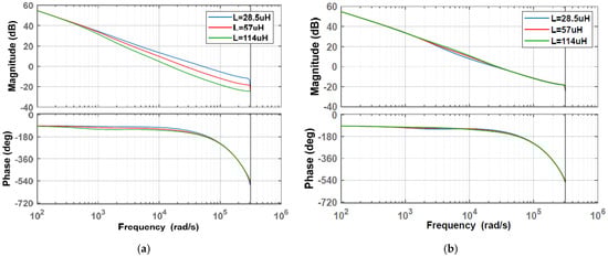Comparatively, L and  in the system with inductance monitoring are set to the same value, both changing from 28.5 μH to 114 μH. As shown in Figure 6b, the poles still change when L varies from 28.5 μH to 114 μH, but the pole change caused by L variation is much smaller, indicating that the system can maintain its high performance. The crossover frequency and phase margin of Figure 7b are also listed in Table 1. When L changes to 28.5 µH/114 µH, the change in crossing frequency is very small, and the phase margin only decreases by a maximum of 7 degrees. Therefore, inductance monitoring can effectively reduce the effect of inductance variation on system stability and transient response capability.