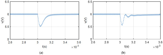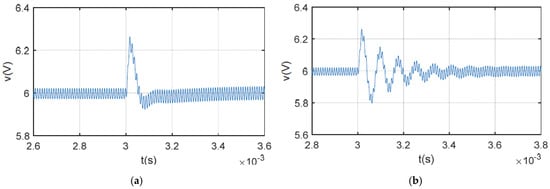 Figure 8 shows the simulation results for the output voltage when the load changes. As shown in Figure 8a, the SCM-controlled buck converter using the proposed method stabilizes within 220 μs. However, for the system without inductance monitoring, the output voltage recovers to 6 V with 330 μs, which is 50% longer. The simulation results for output voltage when the line voltage steps are presented in Figure 9. Ringing occurs in the system without inductance monitoring, causing the output voltage to take 600 μs to stabilize. The transient time is twice that of the system under the proposed algorithm. The simulation results shown in Figure 8 and Figure 9 are consistent with the robustness analysis in the previous section.