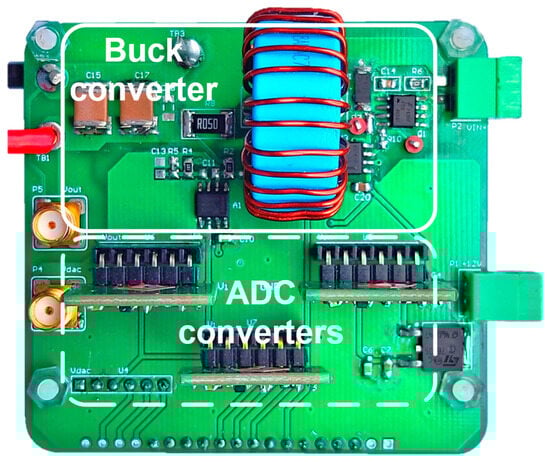 A digitally controlled buck converter was constructed to validate the performance of the proposed method. The prototype is shown in Figure 10, and its specifications are consistent with that of the simulation. An FPGA (Cyclone IV) board was employed to implement the SCM controller and the proposed inductance monitoring method. For the main circuit, a MOSFET (FDS86540, ON Semiconductor, Phoenix, AZ, USA) and diode (NRVTSA4100E, ON Semiconductor, Phoenix, AZ, USA) were adopted as switching devices. CKG57NX7S2A226M500JH (TDK, Japan) was used as the output capacitor. The specifications are shown in Table 3. Two AD converter chips (LTC2314-14, Linear Technology, Milpitas, CA, USA) were used to sample line and output voltages.