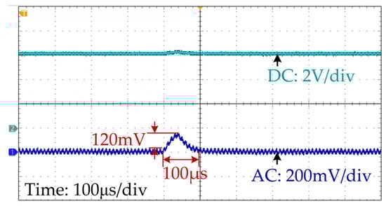 The output voltage waveforms of the system with the proposed method and without inductance monitoring when line voltage rises from 10 V to 12 V are shown in Figure 16a and Figure 16b, respectively. As shown in Figure 16a, for the system with the proposed method, the output voltage deviates by 420 mV and takes 220 μs to stabilize, while for the SCM controller without inductance monitoring, the stabilization time of the output voltage is 470 μs, shown as Figure 16b, which is 113.6% longer.
