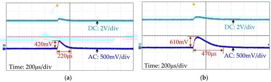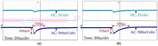 Output voltage waveforms when the line voltage step changes from 10 V to 12 V: (a) with proposed method; (b) without inductance monitoring.