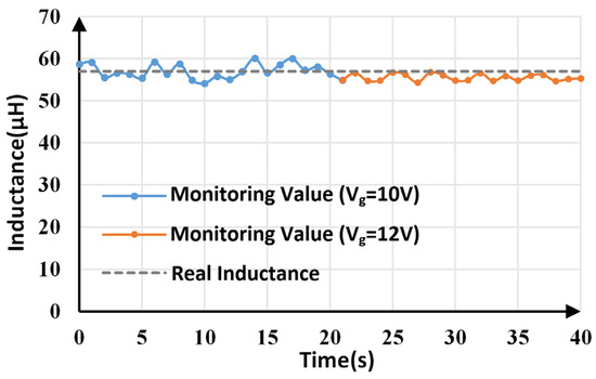 L in the buck circuit is set to 28.5 μH to stimulate inductance drift, and  in the digital controller is set to 57 μH, which is the nominal value. Table 2 presents the simulation results for inductance monitoring when load/line voltage changes are made. The relative error of inductance estimation is between 0.28% and 1.92%, indicating load/input voltage variations have little impact on the inductance monitoring simulation results.