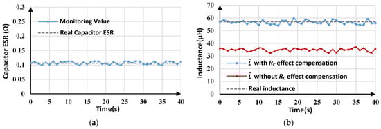 The online monitoring results for RC and L are shown in Figure 17a and Figure 17b, respectively. As Figure 17a shows, the average value (0.107 Ω) of the estimated RC is very close to the actual value (0.106 Ω). The estimation results vary from 0.099 Ω to 0.113 Ω, which is caused by sampling and quantization errors. The effectiveness of RC estimation is reflected by the inductance monitoring results. As shown in Figure 17b, the inductance monitoring results without RC effect compensation fluctuate around 34.933 µH, which deviates from the actual value by 38.71%, while for inductance monitoring with RC effect compensation, the maximum tracking error is only about 5%, indicating that RC estimation and compensation effectively improve inductance monitoring accuracy.