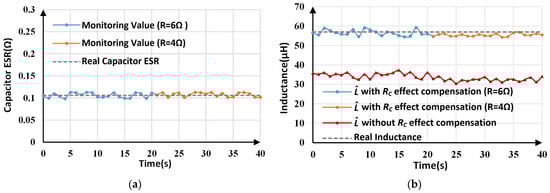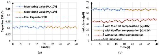 The monitoring results for RC and L under load and line voltage variations are depicted in Figure 18 and Figure 19, respectively. For  with RC effect compensation, a comparison of the experimental results before and after the load/line voltage changes is listed in Table 6. When the load changes to 4 Ω, the RC estimation results change between 0.101 Ω and 0.113 Ω, with an average value of 0.108 Ω. By using the estimated RC to inductance calculation, inductance monitoring results with an error of less than 5% are obtained. Similarly, when the line voltage changes to 12 V, the maximum inductance tracking error is about 4.57%.
