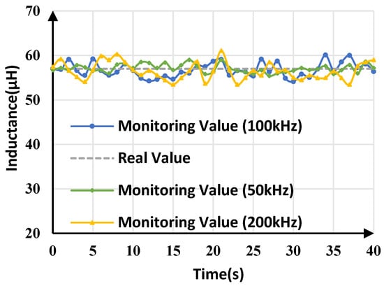 Buck converters with different switching frequencies have different transient states during signal injection, which may affect the accuracy of inductance monitoring. To investigate this effect, buck converters with different switching frequencies (50 kHz/200 kHz) were tested, and the inductance monitoring results are shown in Figure 20. As Table 7 shows, the average monitoring values of inductance at 50 kHz, 100 kHz, and 200 kHz are 57.089 μH, 56.781 μH, and 56.46 μH, respectively, and the monitoring errors are less than 1%. The maximum tracking error of inductance at 50 kHz is 3.53%, which is the smallest error among these three switching frequencies, while the maximum tracking error of inductance at 200 kHz is 7.20%, which is the highest. This indicates that as the switching frequency increases, the maximum monitoring error gradually increases. The reason is that at lower switching frequencies, the output voltage variations caused by signal injection increase, thereby reducing the impact of output voltage measurement noises and quantization errors on inductance monitoring.
