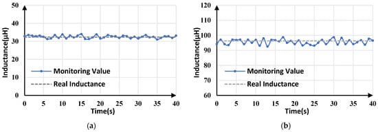 To verify the accuracy of the proposed algorithm under different inductance conditions, different inductors (33 µH/100 µH) were used for experimental testing. The inductance monitoring results are shown in Figure 21. The actual values of inductance were measured by an LCR meter, at 32.38 µH and 96.28 µH. The average monitoring values of Figure 21a,b are 32.52 µH and 95.628 µH, respectively, which are all close to the actual values. In Figure 21a, the maximum and minimum monitoring values are 33.839 μH and 3.021 μH, respectively. In Figure 21b, the maximum and minimum monitoring values are 98.702 μH and 92.541 μH, respectively. The maximum tracking error in both cases is less than 4.5%, meaning that the correlation between inductance estimation accuracy and inductance value is not significant.