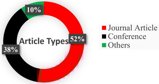 Figure 2 depicts the article selection process, while Figure 3 demonstrates the percentage of journals, conferences, and other ratios. Figure 4 shows the distribution of the year-wise number of references.