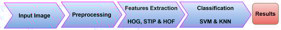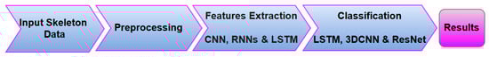 Figure 5 demonstrates a common workflow diagram of the RGB-based action recognition methods. The early stages of research regarding HAR were conducted based on the RGB data, and initially feature extraction mostly depended on manual annotation [,]. These annotations often relied on existing knowledge and prior assumptions. After this, DL-based architectures were developed to extract the most effective features and the best performance. The following sections describe the dataset, the methodological review of RGB-based handcrafted features with ML, and various ideas for DL-based approaches. Moreover, Table 1 lists detailed information about the RGB data modality, including the datasets, feature extraction methods, classifier, years, and performance accuracy.