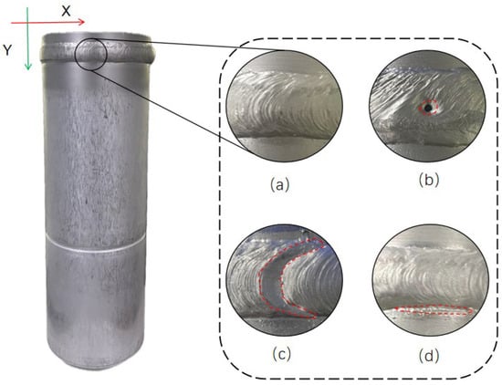 Reservoirs and welds with different types of defects. Defects are circled in red: (a) normal weld; (b) hole defects; (c) arc crater defects; (d) undercut defects.
