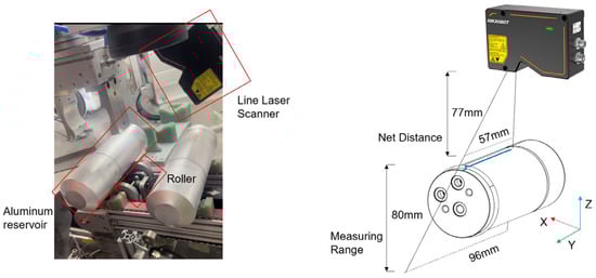 This study focuses on acquiring extensive 3D point cloud data from the surface of an aluminum reservoir during production. The defect detection system, along with the point cloud data acquisition device, is illustrated in Figure 2. The detection system can be divided into three parts: PLC, executive mechanism, and vision system. During detection, the PLC controls the executive mechanism to move the reservoir to the designated position and controls the motor to drive the rollers at the bottom of the reservoir to rotate at a constant speed. At the same time, the PLC sends a detection signal to the visual system, which controls the line laser profiler to scan the product at a fixed frequency and output the detection result. The PLC controls the executive mechanism to unload the product according to the detection result.