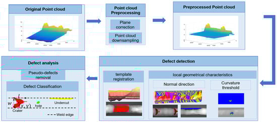 In recent years, machine vision-based image processing and point cloud processing have gained popularity in the field of defect detection due to their cost-effectiveness and ease of deployment. Early applications based on 2D image processing laid the foundation for welding defect detection. For example, Burch, S. F [] proposed an image processing-based weld image processing system that allows for real-time monitoring and analysis of inspection results. However, those methods had limitations in defect extraction. Subsequent studies have introduced improved methods, such as extracting texture features from gray-scale co-occurrence matrices and two-dimensional Gaussian functions [], which have improved the classification accuracy. In addition, methods based on fuzzy set theory and low-pass filtering have been widely used to improve defect detection algorithms. J Sun et al. [] proposed a modified background subtraction method based on a Gaussian mixture model to extract the feature regions of weld defects. Then, they designed a weld detection and classification algorithm based on the extracted features. Despite these advances, 2D image processing still has difficulties in accuracy due to its susceptibility to lighting conditions, thus limiting its wide application.
