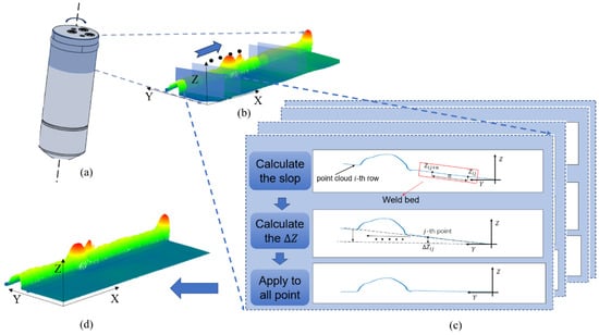 During the process of data acquisition, the tilt and distortion of the collected data may be attributed to several factors, including the angle at which the sensor is erected, mechanical vibration of the platform, and non-centering of the rollers. To address this issue, the collected data are typically subjected to plane correction. For plane correction, Random Sample Consensus (RANSAC) is a widely used method for fitting planes, particularly effective when correcting angles between the camera and the subject being photographed []. However, RANSAC is less effective in addressing distortions caused by eccentric rotation of the product, as illustrated in Figure 4a,b. To address this issue, this paper employs a slope-based correction method tailored to the characteristic that the surface of the point cloud is a ruled surface.