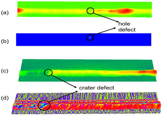 Surface defects of welds typically manifest as holes, undercuts, and craters. Among these defects, holes are among the most prevalent. Figure 5a illustrates the scanning results of a weld exhibiting hole defects on the surface. These defects are typically characterized by the emergence of pits or voids on the surface of the weld. Consequently, the alteration in surface characteristics is more discernible in the region of the defect than in other areas.