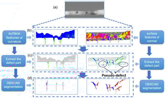 The surface curvature of the hole defect region is highly variable and possesses a higher degree of curvature than that observed in the smooth surface of a normal weld. Based on the aforementioned geometric analysis, a surface curvature-based algorithm was employed for the detection and characterization of the defects. As illustrated in Figure 6b, the curvature of the defective region is markedly elevated in comparison to that of the typical region of the weld. Furthermore, the closer the region is to the center of the hole defect, the higher the curvature. Consequently, the damage region can be extracted by establishing the neighboring points  and the curvature threshold , utilizing varying curvatures. The curvature parameter of the feature points is employed as one of the threshold values for the extraction of the final point cloud, which is deemed to be the correct damage region. The results of the extraction are illustrated in Figure 6c, which depicts the extracted defective region point cloud. The method demonstrates effective extraction of the hole defective region. Subsequently, the DBSCAN (Density-Based Spatial Clustering of Applications with Noise) algorithm is employed to perform a clustering operation on the aforementioned threshold-segmented point cloud. The clustering result is illustrated in Figure 6d.
