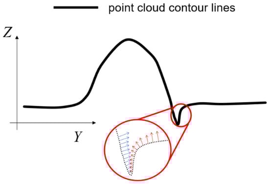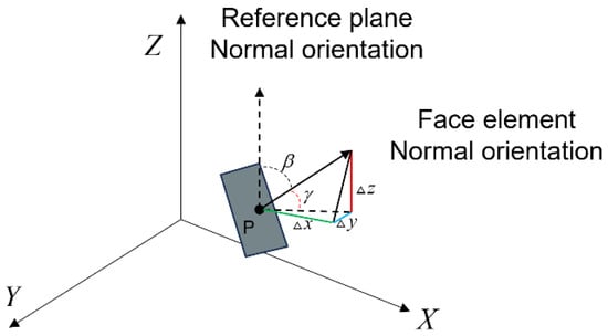 As illustrated in Figure 7, point  represents a specific point within the point cloud. The angle  represents the discrepancy between the vector and the normal vector of the surface of point . Similarly, the angle  denotes the angle between the horizontal reference plane and the normal vector of the surface of point . The value of  can be calculated using the following Equation: