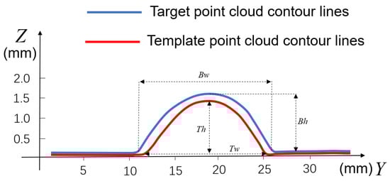 Since it is not possible to have a perfect match between the fabricated standard template and the target weld, especially because the width and height of the weld are not exactly the same in different weld seams, the standard template needs to be adjusted to the dimensions of the target weld in order to minimize the subsequent fitting error. As shown in Figure 9, we achieve this by defining the scaling matrix  with the scaling factor , which is as in Equations (7) and (8):