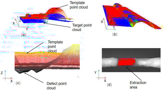 Figure 10a,b illustrate a comparison of the welds before and after registration. Figure 10c illustrates the alignment outcomes of the defective region, which can be further delineated by calculating the distance between the aligned template and the target weld. Subsequently, a k-d tree calculation is conducted on both point clouds following alignment, thereby facilitating the expeditious identification of neighboring points. The nearest template point cloud to each point of the target point cloud is identified using a k-d tree, and the distance between the two Z-axis heights is calculated. The height threshold serves to distinguish between points that are deemed to be defective and those that are not. Points whose height difference exceeds the threshold are extracted and clustered, thereby enabling the segmentation of the candidate region and the subsequent extraction of the defective region. The extraction effect is illustrated in Figure 10d.