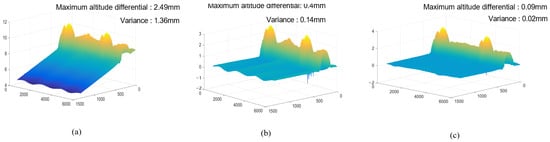 We used the Gaussian variance of the maximum height difference and height difference in the planar region to verify the effect of planar correction. A comparison of using RANSAC with the present method is shown in Figure 11, where (a) is the weld before correction, (b) is the result of correction using the RANSAC method, and (c) is the result of correction by the present method.