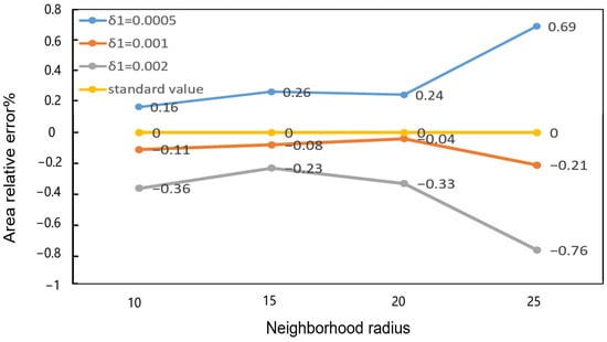Five groups of point clouds with varying hole sizes were selected to form the defect data for experimentation. The ratios of extracted area to measured area were calculated for varying parameters. The results are shown in Figure 12, where the horizontal coordinate represents the radius of curvature neighborhood, while the vertical coordinate depicts the relative error between the extracted defect area and the actual measured area with different curvature thresholds and neighborhood radii. A value closer to the standard value in the horizontal coordinate indicates a superior extraction effect.
