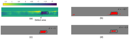 The value of the height threshold determines the extraction effect of the point cloud after alignment. Figure 13 shows the extraction result when using different height threshold values: Figure 13a represents the difference between the points of the point cloud after alignment, and we only consider the case where the difference is less than zero. The darker the color, the deeper the defect. In order to avoid false detection, it is necessary to choose an appropriate depth threshold. If the threshold is too low, it will lead to false detection of the weld edge region, as shown in Figure 13b. If the threshold is too high, it will lead to incomplete extraction of the crater region, as shown in Figure 13d. After experimenting, the height threshold was set to −1 for the best extraction of defects.