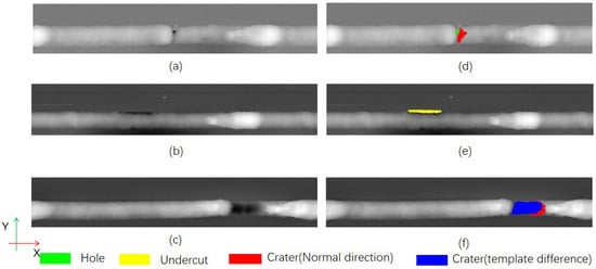 Different types of defects and their extraction results: (a) depth map of hole and crater defects; (b) hole and crater defect extraction results; (c) depth map of undercut defects; (d) undercut defect extraction results; (e) depth map of crater defects; (f) crater defect extraction results.