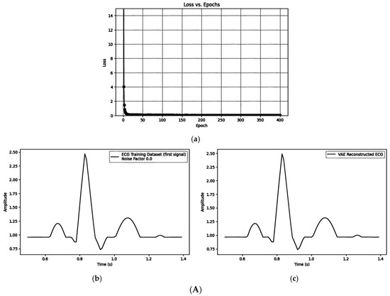 (A) Embedding a watermark into the mean () of the VAE model: (a) the loss vs. epochs; (b) ECG training data; and (c) VAE model-generated ECG embedded with a watermark. (B) Embedding a watermark into the latent variable (z) of the VAE model: (a) the loss vs. epochs; (b) ECG training data; and (c) VAE model-generated ECG embedded with a watermark in the latent variable (z). (C) Embedding a watermark through the frequency domain: (a) the loss vs. epochs; (b) the reconstructed ECG with the VAE model; and (c) ECG embedded with a watermark.