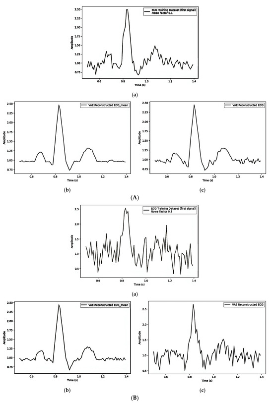 (A) Embedding the watermark in the mean () with noise_factor = 0.1: (a) first original training signal; (b) mean of all training signals; and (c) VAE-reconstructed signal with watermarking. (B). Embedding the watermark in the mean () with noise_factor = 0.3: (a) first original training signal; (b) mean of all training signals; and (c) VAE reconstructed signal with watermarking. (C) Embedding the watermark in the mean () with noise_factor = 0.5: (a) first original training signal; (b) mean of all training signals; and (c) VAE-reconstructed signal with watermarking.