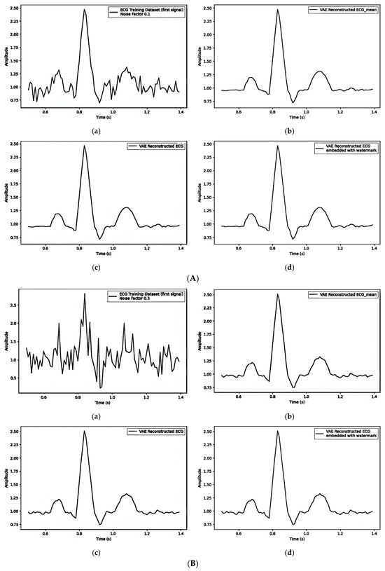 Table 5 illustrates how different noise factors impact watermark embedding in ECG signals through the latent variable (), focusing on the Mean Squared Error (MSE) and Dynamic Time Warping (DTW) distances. Figure 10A–C give separate observations for noise factors 0.1, 0.3, and 0.5, and their impact on visual quality and the quantity values are shown in Table 5. The values of MSE and DTW increase as the noise factor increases.