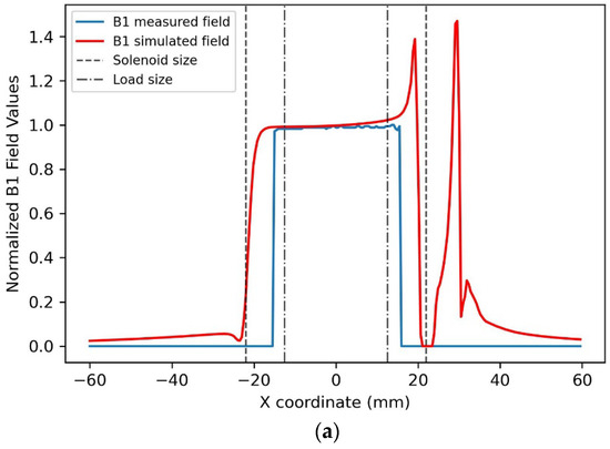 The solenoid magnetic field pattern, which can be observed in Figure 3, is very homogeneous along the X and Y coil axes. The homogeneity in the FOV of interest is high, corresponding to the B1 field among the simulated/images load that mimics the animal size (Table 1). In the X-axis profile, we can see the presence of the “hot spot” magnetic field generated by the “reclosing conductor”, which does not influence the homogeneity of the magnetic field in the useful FOV. A good homogeneity is also observable in the Z-axis direction (Table 1). By comparing the plots of the simulated magnetic field for the loaded coil with those obtained from the experimental acquisition, it is possible to verify the great accuracy of the full-wave simulation.