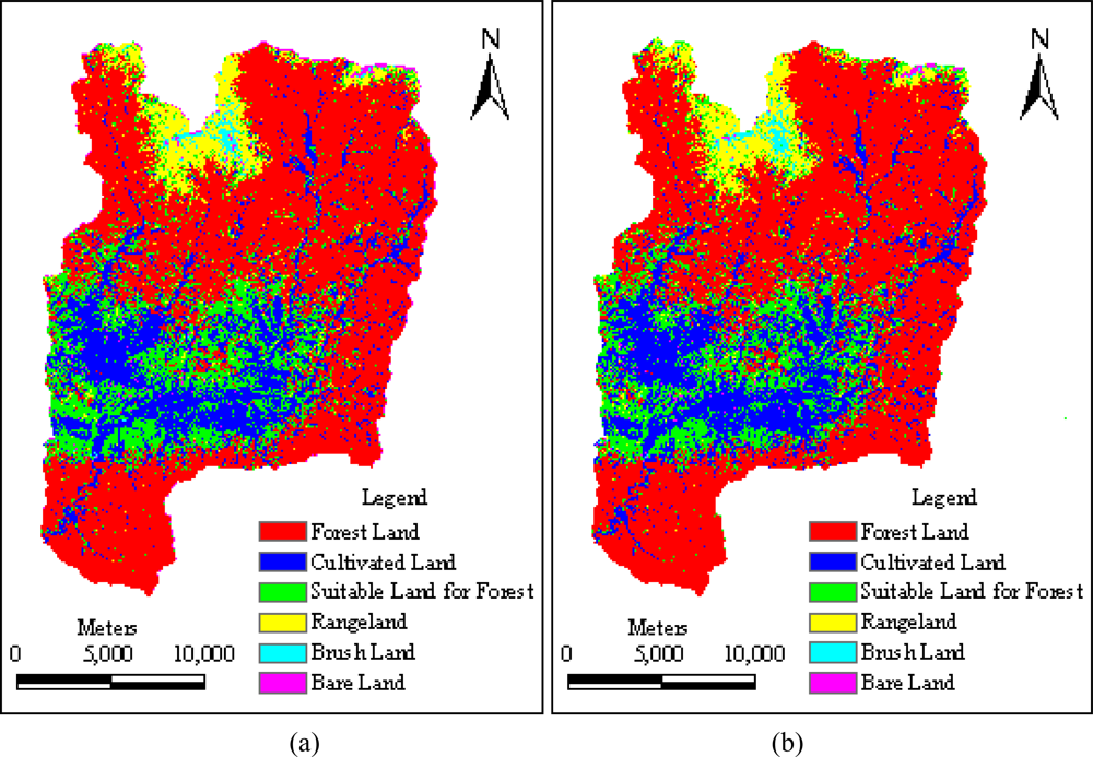 The image was classified using a six category classification scheme, and the six classification categories consisted of forest land, cultivated land, suitable land for forest, rangeland, brush land and bare land. Spectral signatures were created for these six LULC classes of interest using the training data provided from the geographical database, and the classifications were performed using the Gaussian maximum likelihood (GML) classifier. The reason for adopting GML classifier for classification was mainly due to its outstanding performance in considering means, variances and co-variances of training site statistics which favors this classifier, used worldwide and relatively convenient to implement and robust for classification [23]. In this study, four classification schemes were designed as follows: