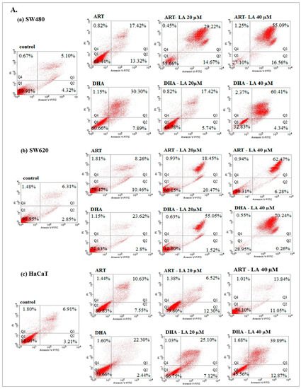 The effect of ART, DHA, and LA (A), ART and DHA with TRFi and LA (B) on late apoptosis in SW480 (a), SW620 (b), and HaCaT (c) cells detected with Annexin V-FITC/PI by flow cytometry. Diagrams show representative experiments. A total of 10,000 events were collected. The lower left quadrant (Q1) represent viable cells and the lower right quadrant (Q2) early apoptotic cells. The upper right quadrant (Q3) contains late stage apoptotic cells, and the upper left quadrant (Q4) necrotic cells.